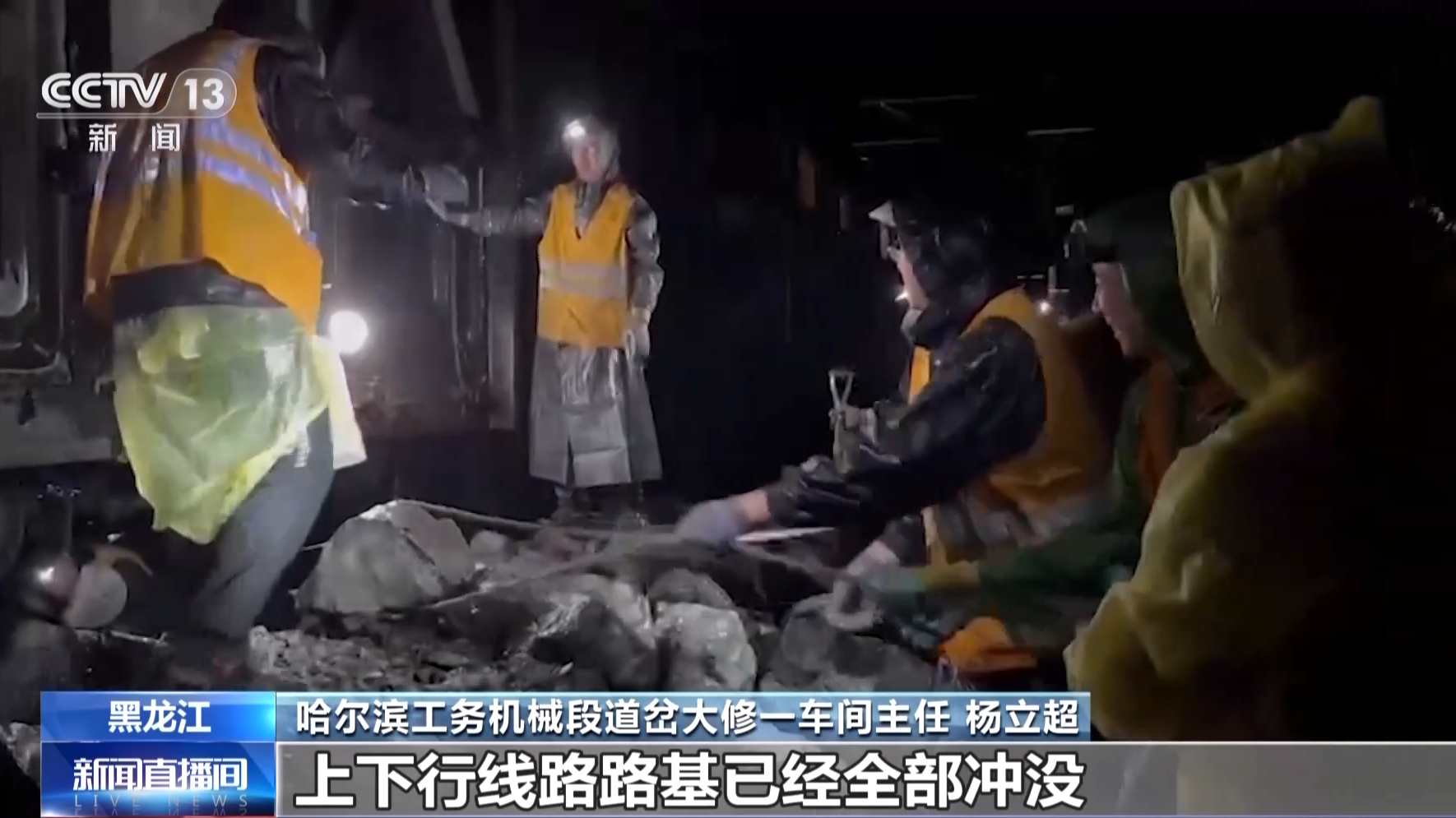 哈尔滨工务机械段道岔大修一车间主任杨立超:当时这个水面已经越过这个钩机履带了,比现在的水位还要高出一米到一米五,上下行线路路基已经全部冲没。