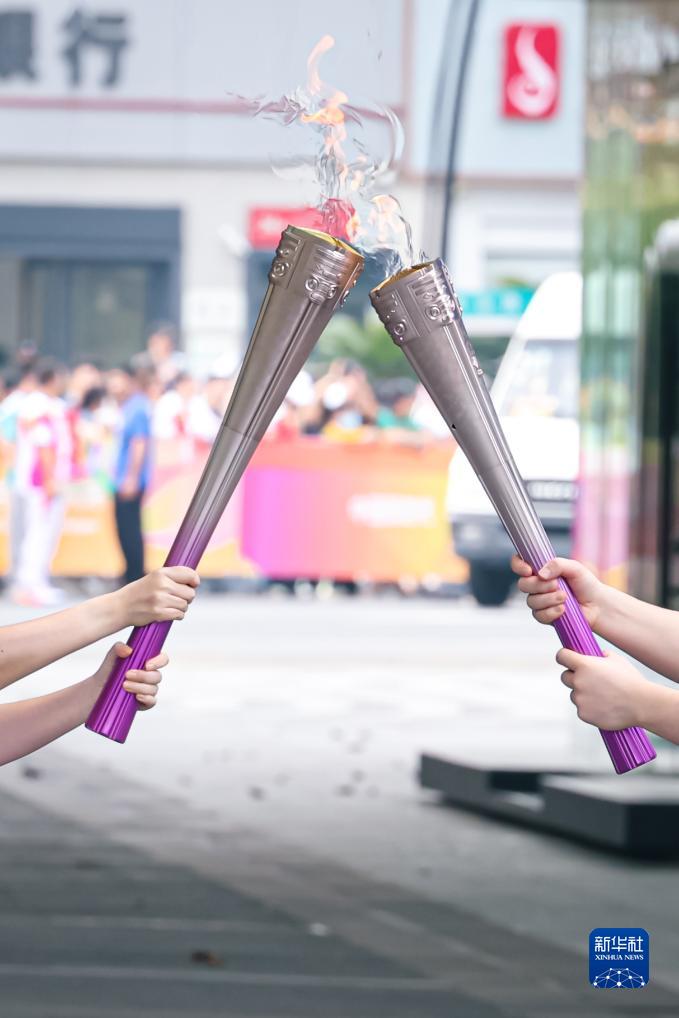9月8日,火炬手张涛(右)与曹琛在火炬传递中。