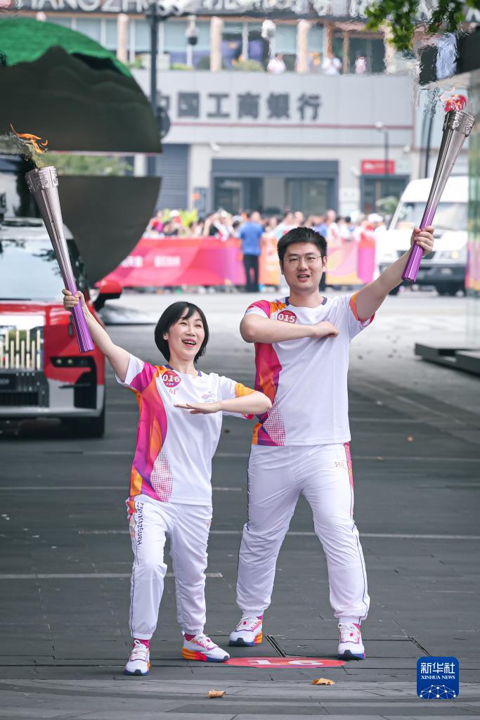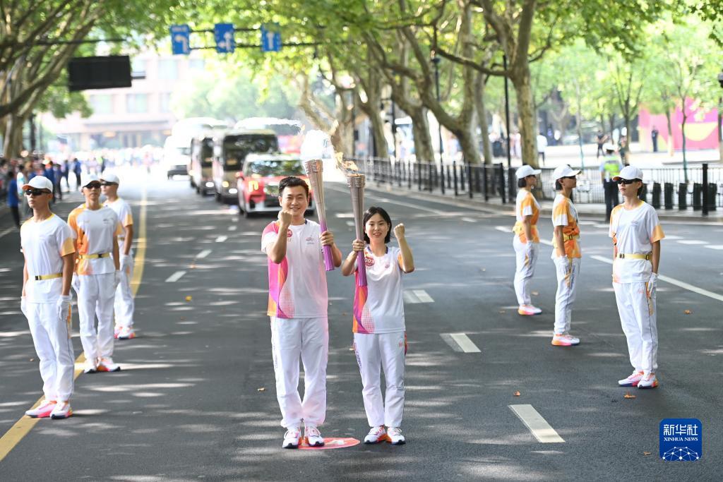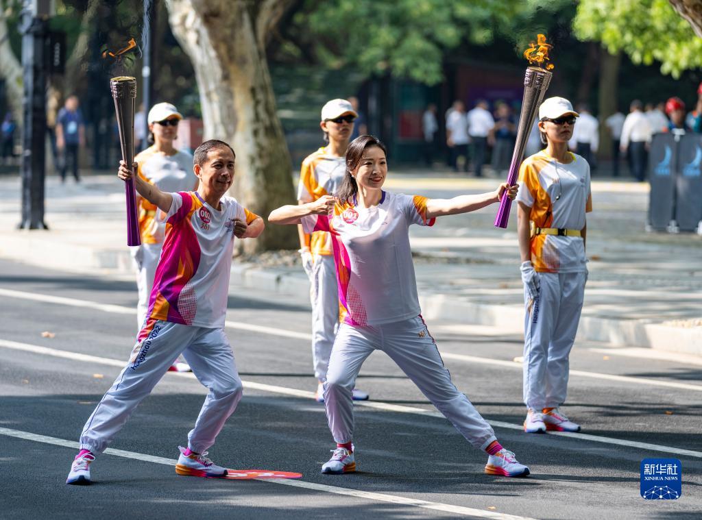 9月8日,火炬手徐川子(右)与钟毅在火炬传递中。