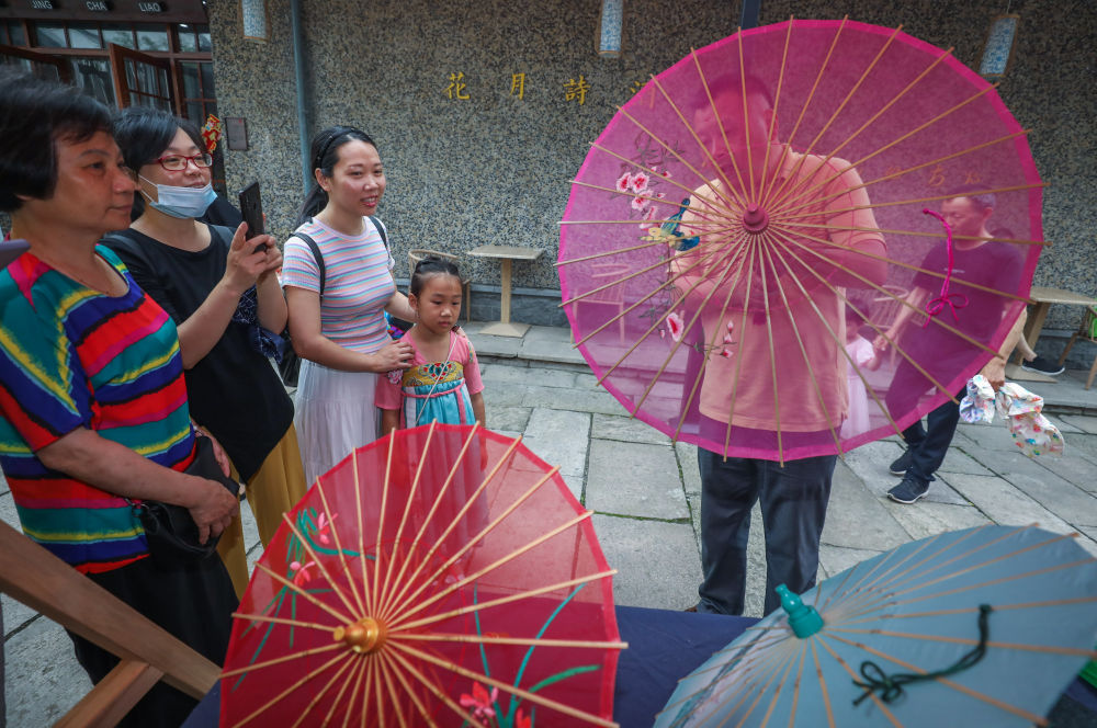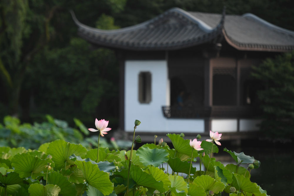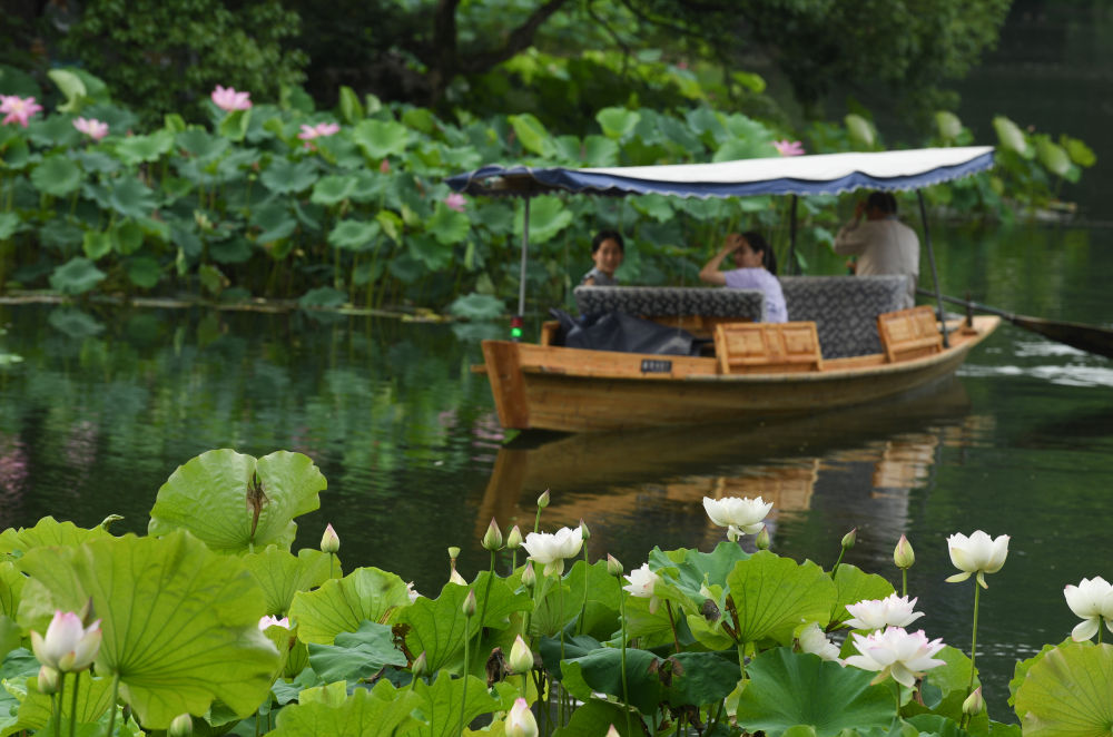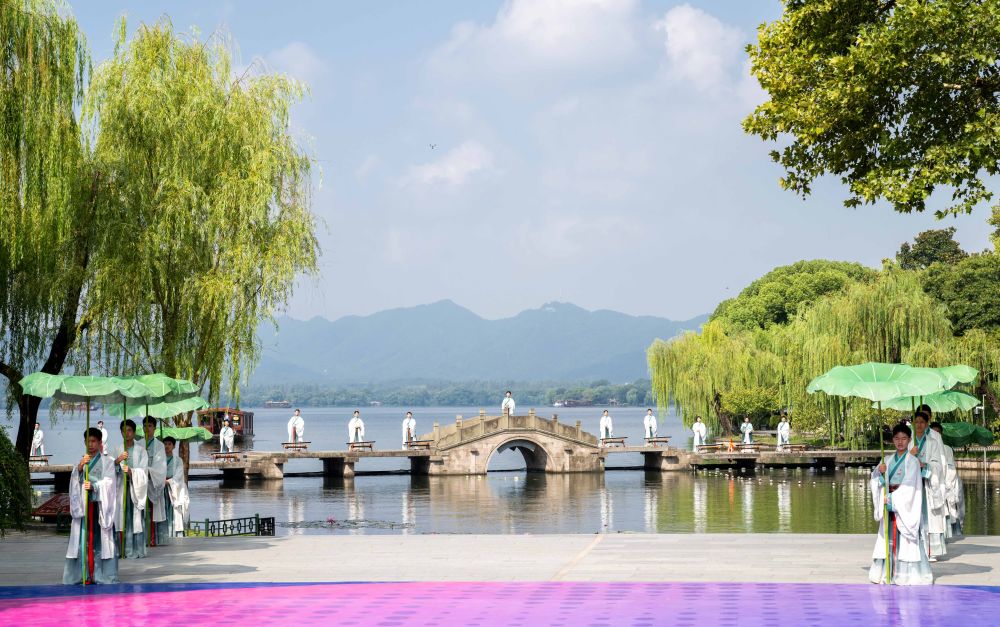 ↑演员在西湖景区进行的G20杭州峰会文艺演出《最忆是杭州》中表演《难忘茉莉花》(2016年9月4日摄)。