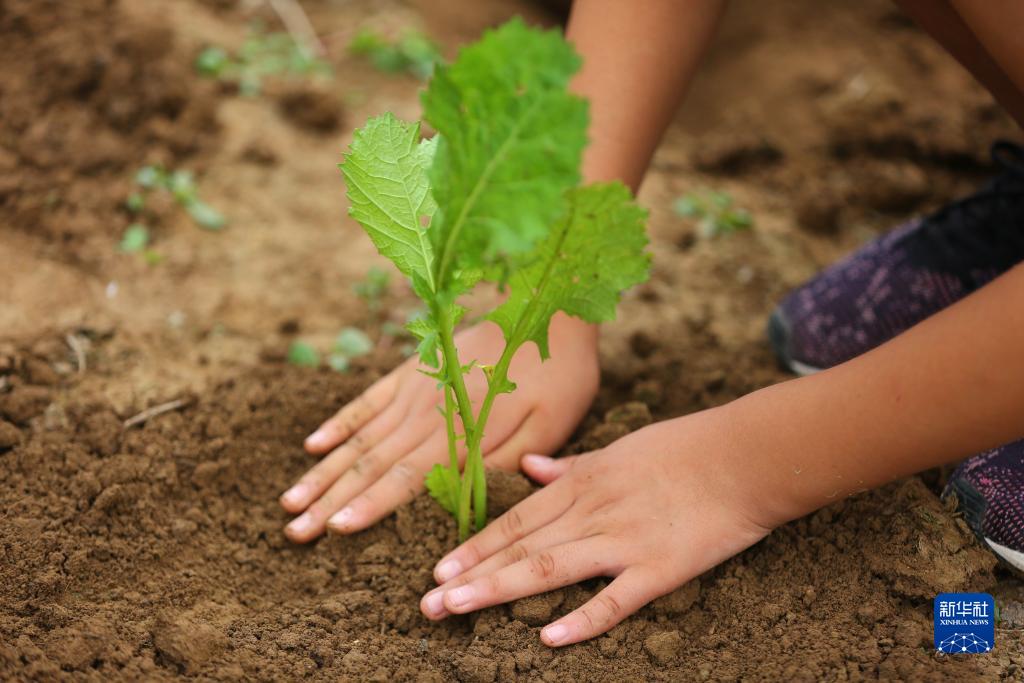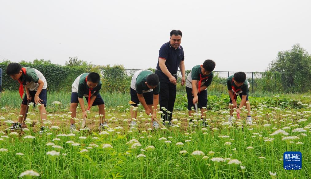 9月9日,在山东省乐陵市朱集中心小学劳动实践基地,学生在田里劳作。新华社发(李志军 摄)