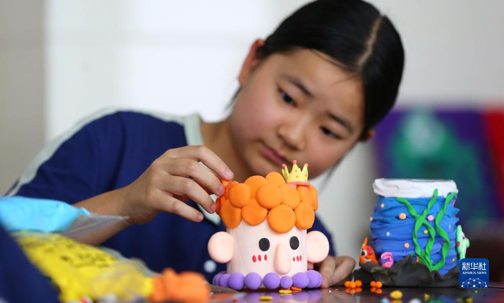 9月9日,在山东省乐陵市开元中学,学生用黏土制作笔筒。新华社发(李志军 摄)