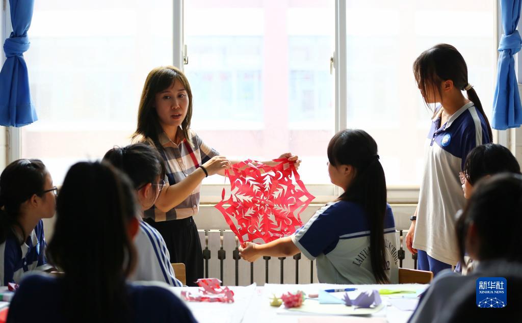 9月9日,在山东省乐陵市开元中学,老师指导学生学习剪纸。新华社发(李志军 摄)