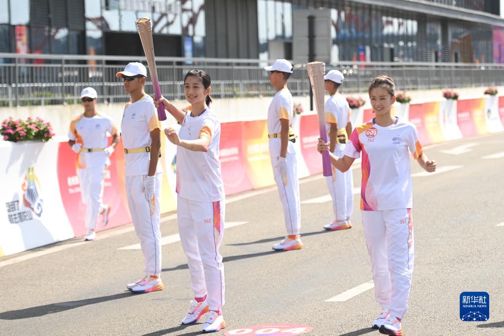 9月13日,火炬手王晓(左)和金可泽在火炬传递中。