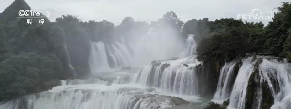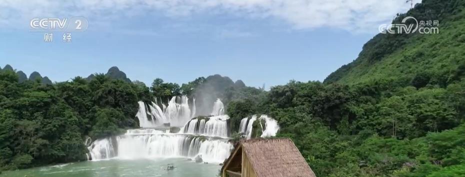 总台记者杨祉禛:中越德天(板约)瀑布跨境旅游合作区以归春河为界,一侧是德天跨国瀑布,也是亚洲第一大跨国瀑布,它的最大宽度200多米,落差可以达到70多米,另一侧是越南的板约瀑布。稻田咖啡屋是瀑布的最佳观景点,游客在这里不仅能欣赏到三级跌落的瀑布美景,同时也能品尝到正宗的越南咖啡。