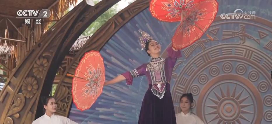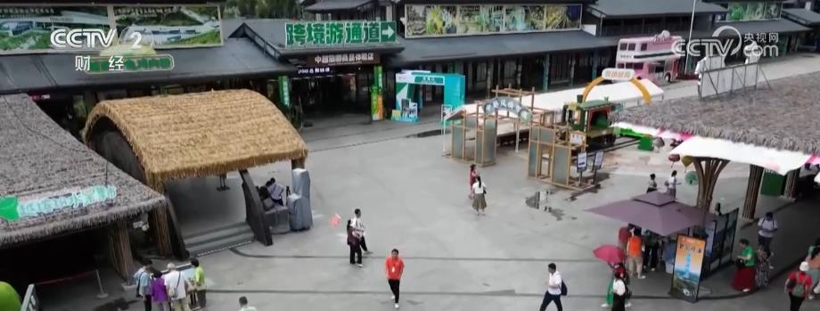总台记者杨祉禛:中越风情街的建筑在设计上融入了壮族对蛙的崇拜,旁边就有一个“蛙神巢穴”,游客可以在这里聆听水声潺潺,听取蛙声一片。除此之外,游客可以在法棍博物馆品尝到越南法棍,沿路感受越南春卷、越南水果捞、广西酸嘢的风味。继续往前到中越跨境街,还能欣赏中越风情舞蹈,获得充满壮乡和越南特色的沉浸式消费体验。
