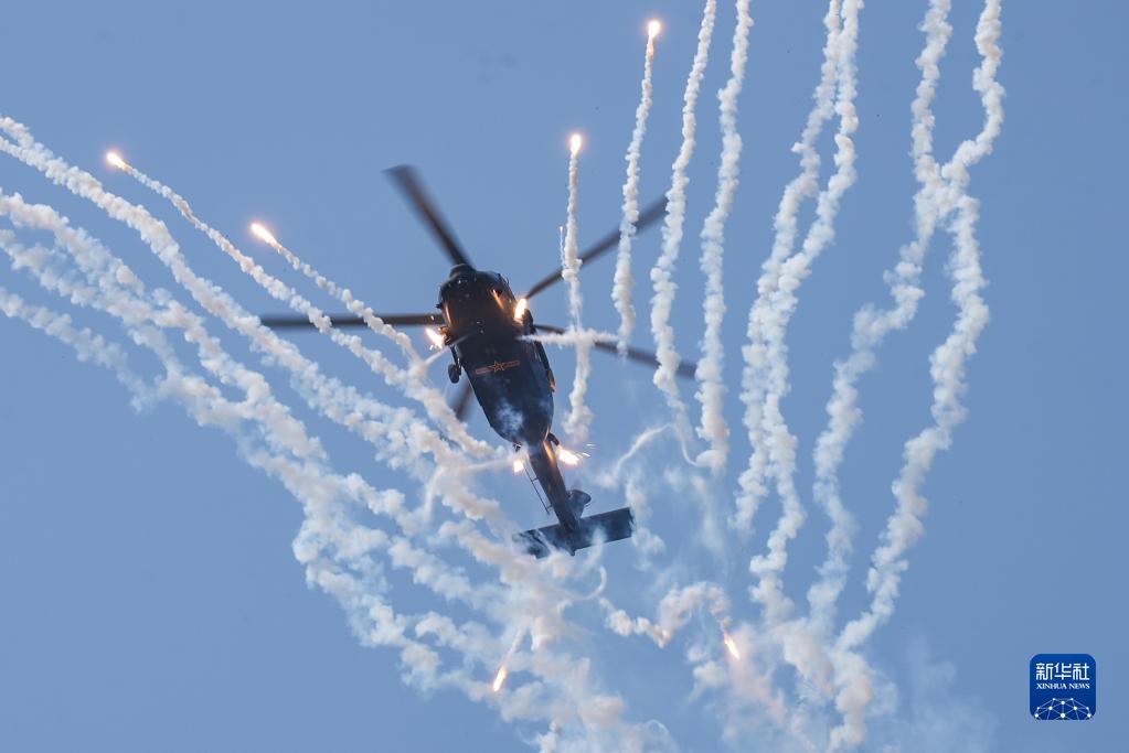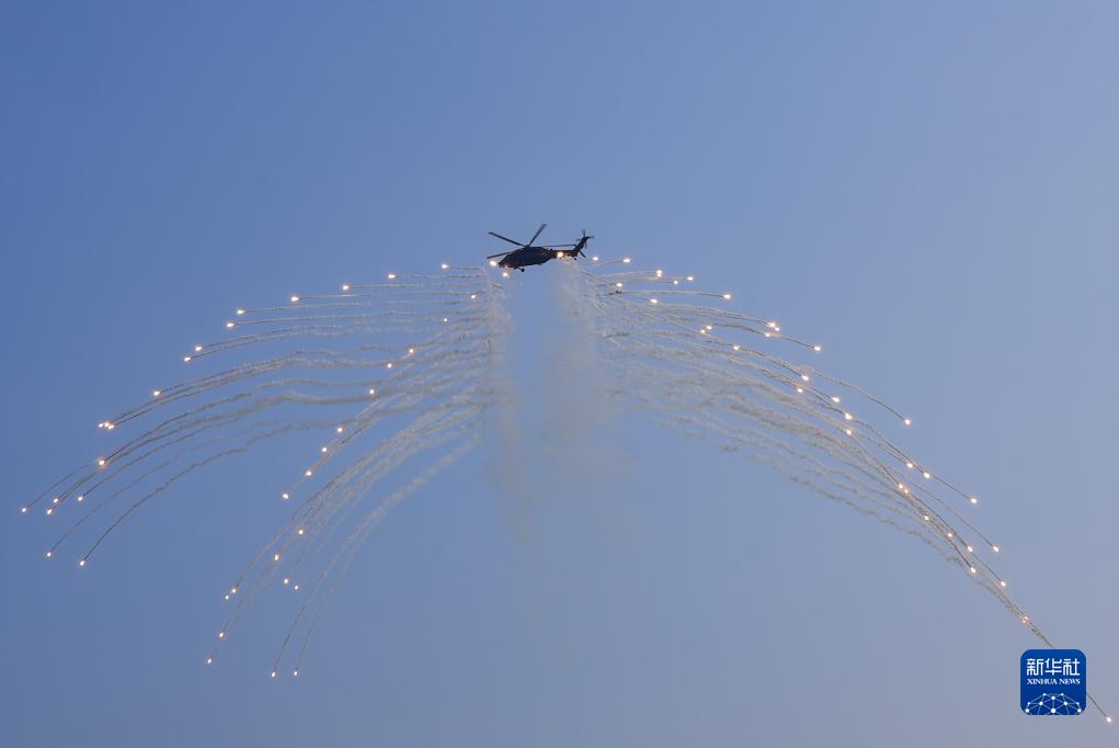 9月16日,陆军“风雷”飞行表演队直-20战术通用直升机发射干扰弹。