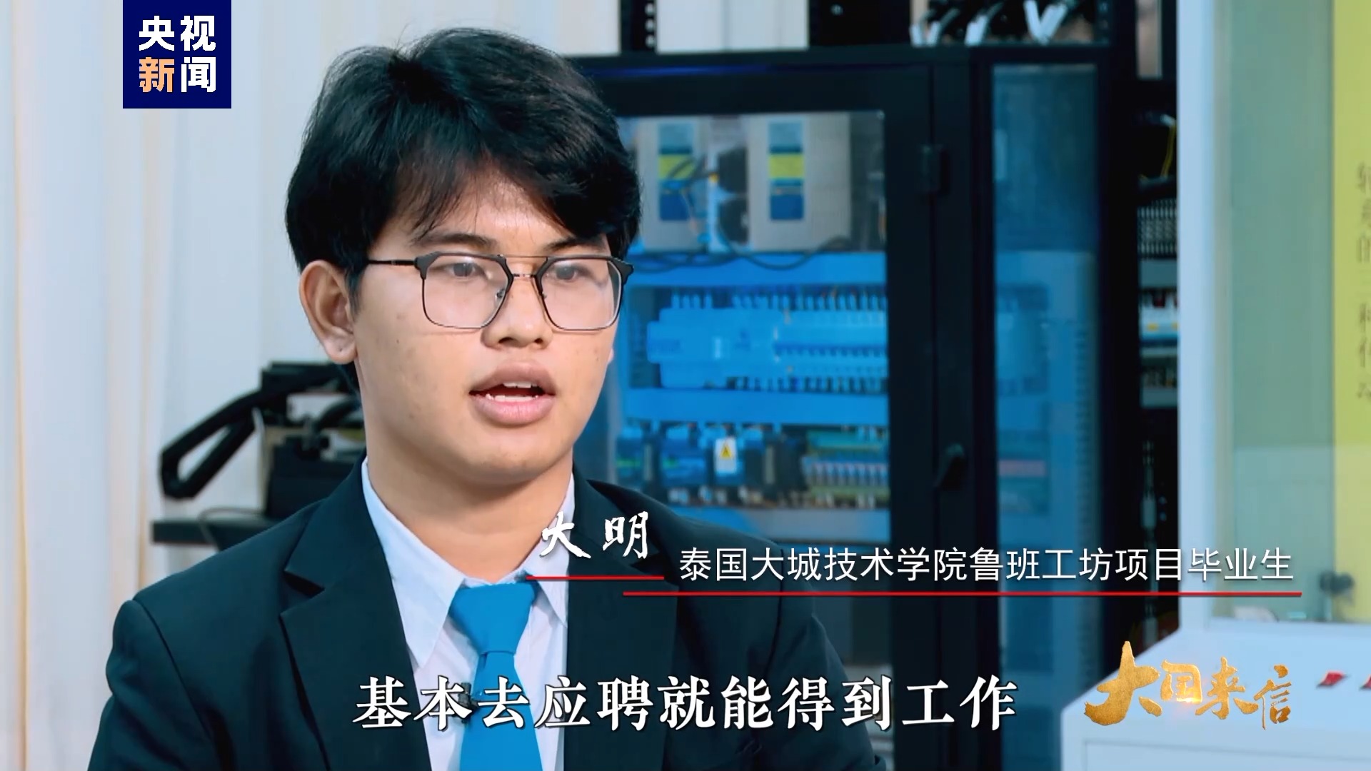 泰国大城技术学院鲁班工坊项目毕业生大明:中国陆续送来机器和教学设备,老师提供的各种教材和教学方式,对我来说都很新鲜。在泰国的中国企业很需要既会技术、又会中文的人才,基本去应聘就能得到工作。鲁班工坊项目对我的人生发展意义重大,拓展了我的人生道路。