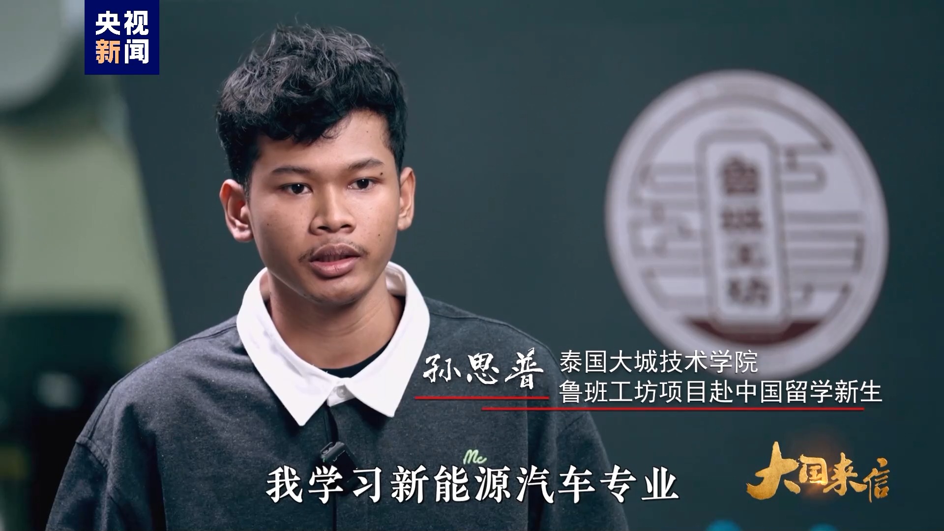 泰国大城技术学院鲁班工坊项目赴中国留学新生孙思普:我学习新能源汽车专业。我认为新能源车是泰国汽车行业的未来。很多中国的新能源车出口到泰国,中国的新能源车比较先进,还比较环保。