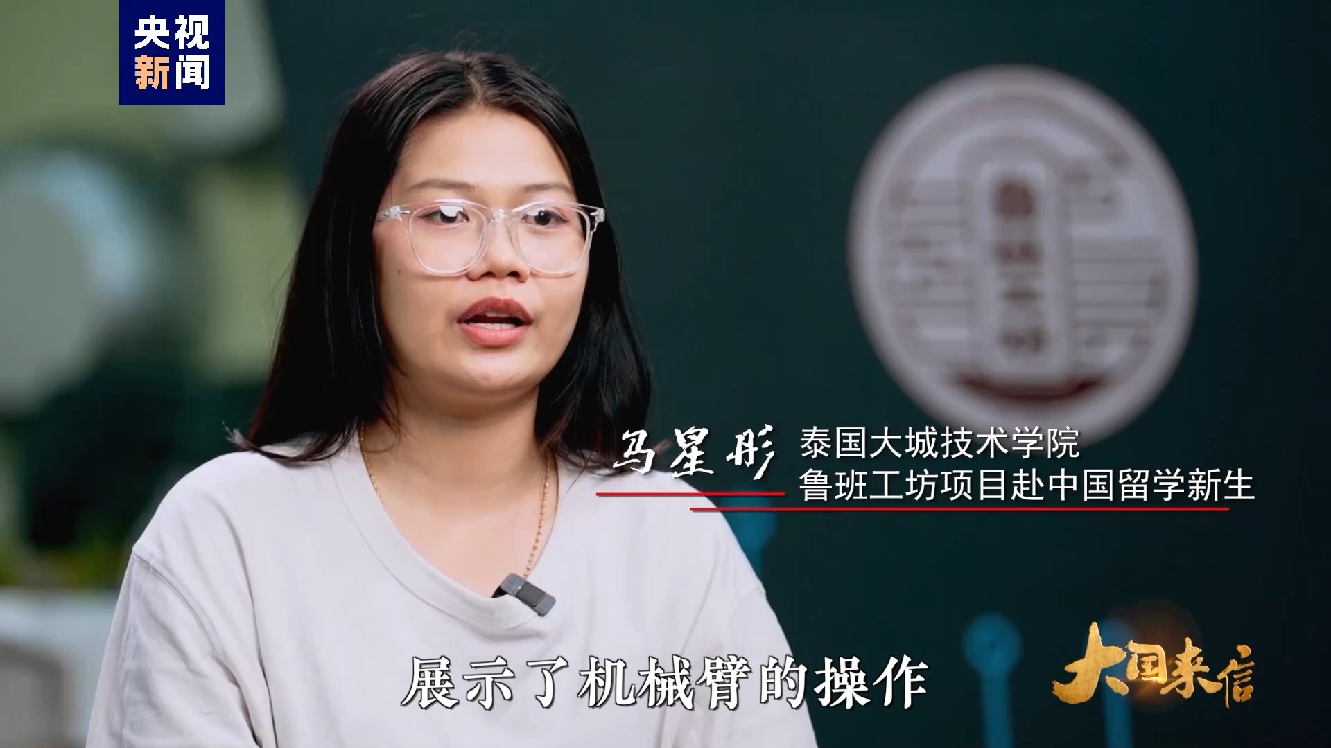 泰国大城技术学院鲁班工坊项目赴中国留学新生马星彤:昨天老师给我们展示了机械臂的操作。我当时就说,我想学这个。老师说,好,我教你。我听了特别开心。