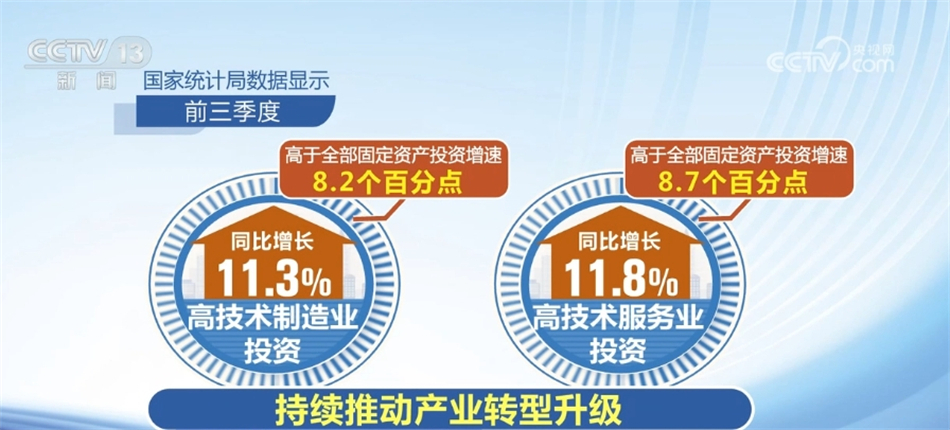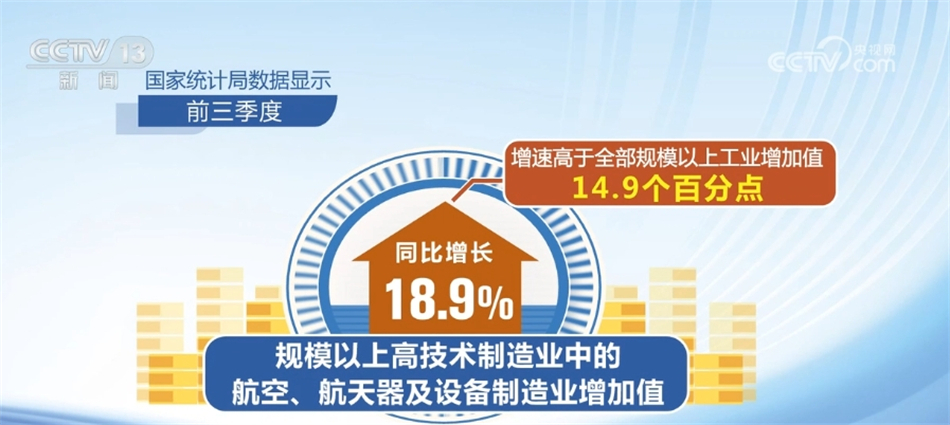 高技术产业投资动力强劲,新动能领域保持较快增长。国家统计局数据显示,前三季度,高技术制造业投资和高技术服务业投资分别同比增长11.3%和11.8%,分别高于全部固定资产投资增速8.2和8.7个百分点,持续推动产业转型升级。规模以上高技术制造业中的航空、航天器及设备制造业增加值同比增长18.9%,增速高于全部规模以上工业增加值14.9个百分点。