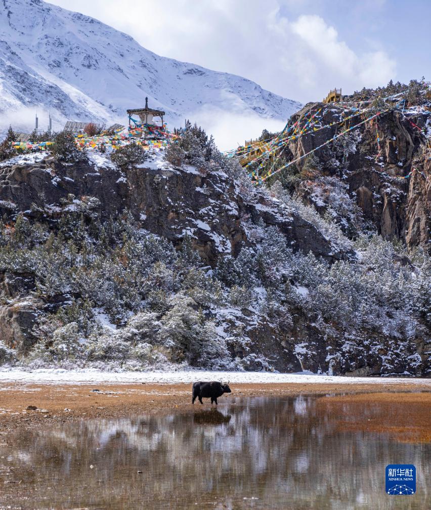 西藏昌都市边坝县位于念青唐古拉山脉南麓,由于海拔较高,10月末的边坝县已迎来降雪。这里雪山耸立,冰洞湛蓝,飞雪绵绵,岩羊在雪面上行走,美景如画。