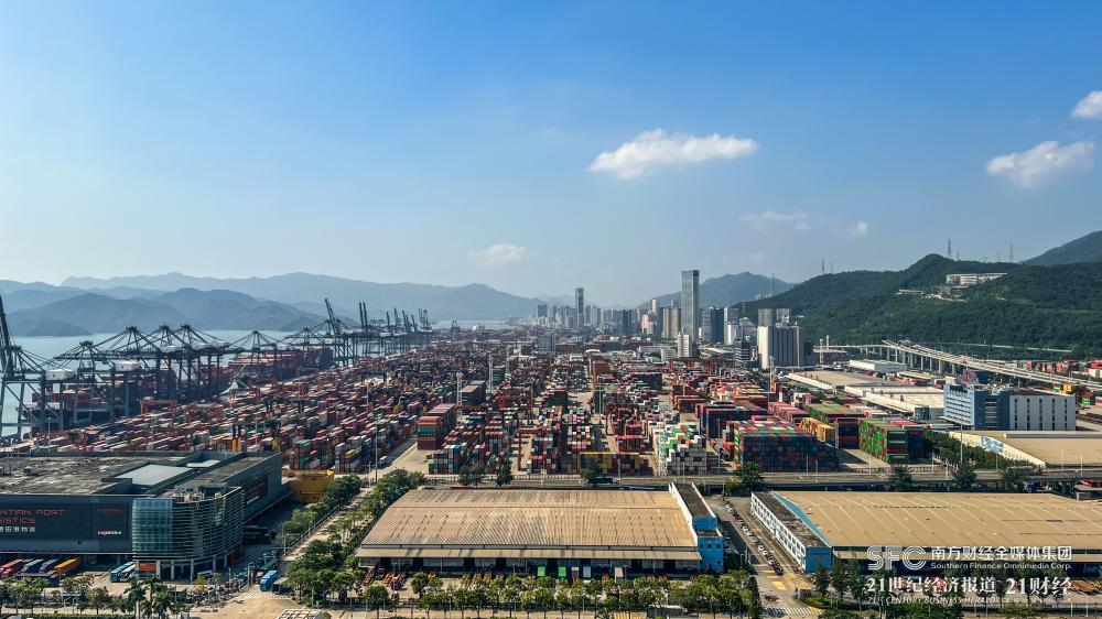 从盐田国际办公楼的窗口向下望,各色集装箱陈列于港口码头,来往的集装箱船舶与货柜车,以及不远处的铁路场站,串起这条国际物流干线的关键一环。