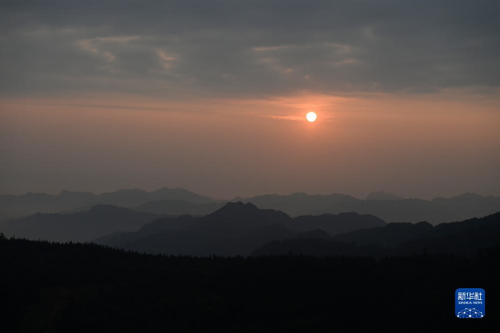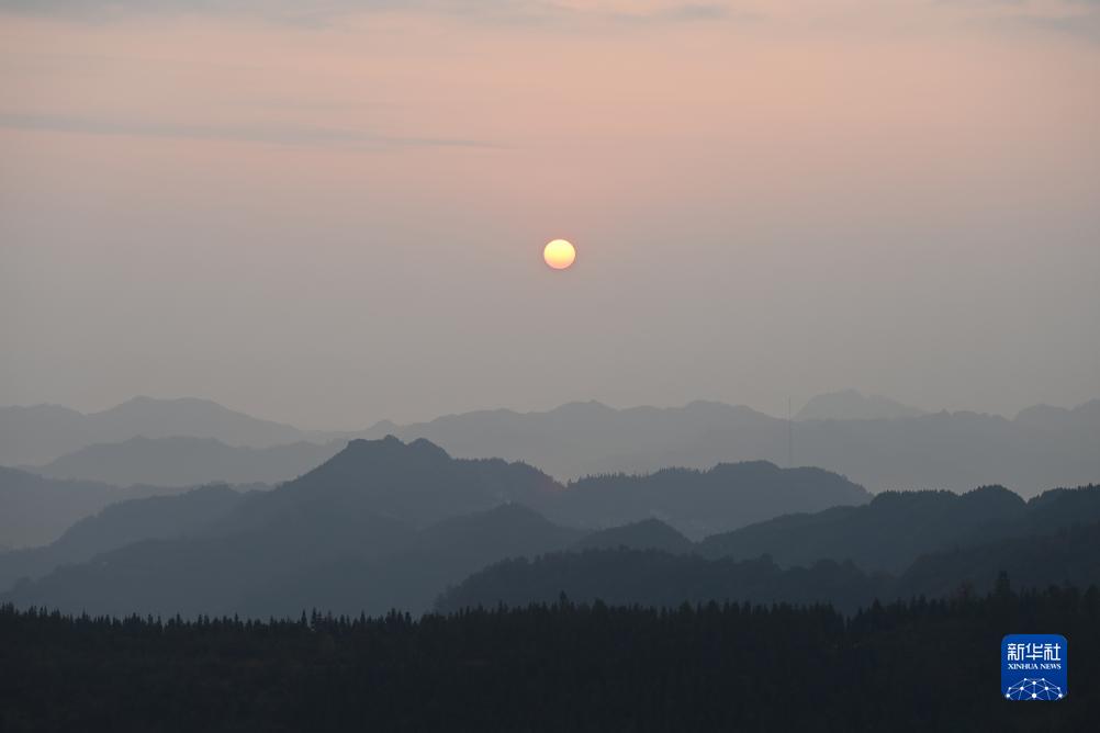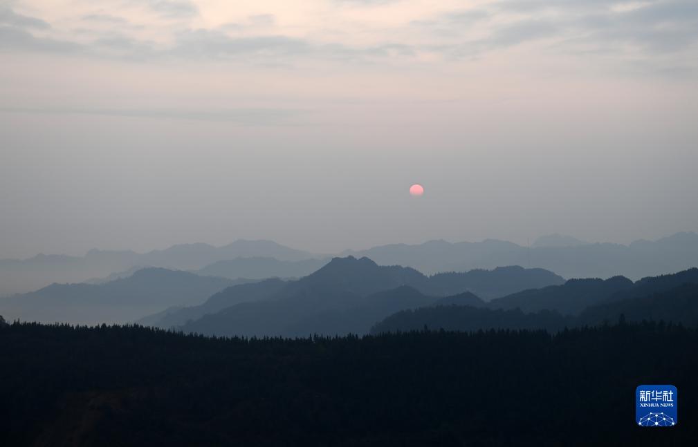当日清晨,广西乐业县红日初升,晨雾中的群山充满诗情画意。