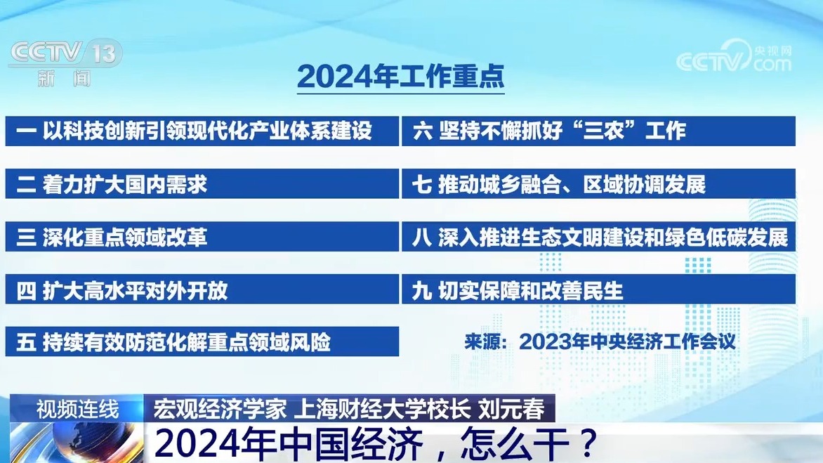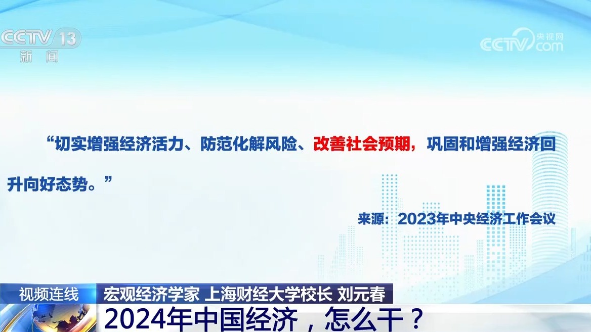 《新闻1+1》今晚连线宏观经济学家、上海财经大学校长刘元春,共同关注:2024年中国经济,怎么干?