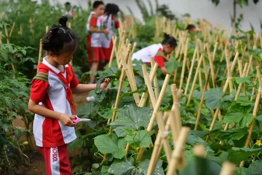 △今年6月,育英学校小农场迎来丰收,同学们在采摘蔬菜。