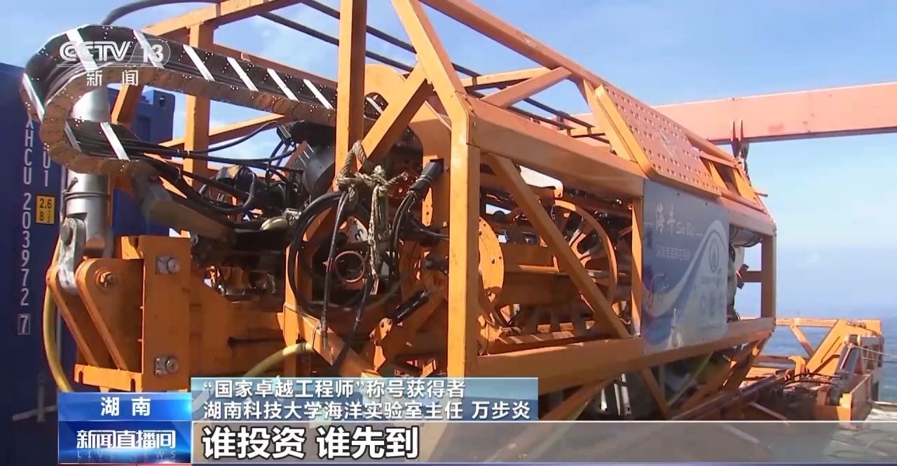 “国家卓越工程师”称号获得者 湖南科技大学海洋实验室主任万步炎:联合国目前采用的规则是谁投资、谁先到,谁就拥有优先开发权。因为公海资源就那么多,实际上说是海底有很多矿产资源,但事实上西方国家已经在那里经营好几十年了,那留给我们的东西就越来越少,所以勘探是必须尽快。