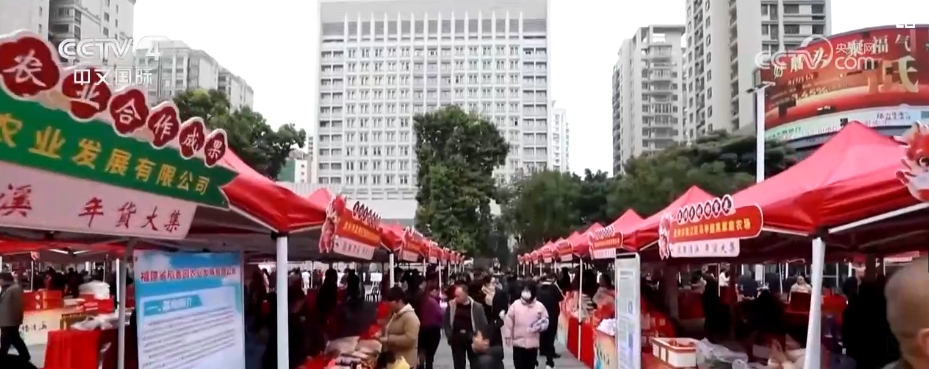 在福建安溪,年货大集也热闹开启,一个个红色帐篷整齐排列,集合了来自安溪各乡镇的特色农产品。