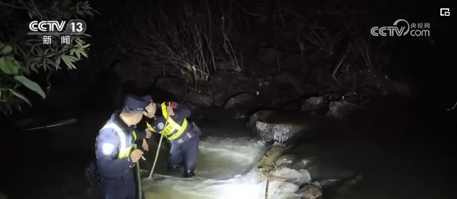 在广西崇左的中越边境线上,凭祥边境管理大队三色桥抵边警务室执勤民警在深夜里巡边,检查边境防护设施,遇到湍急的溪流,挽起裤脚涉水而过。