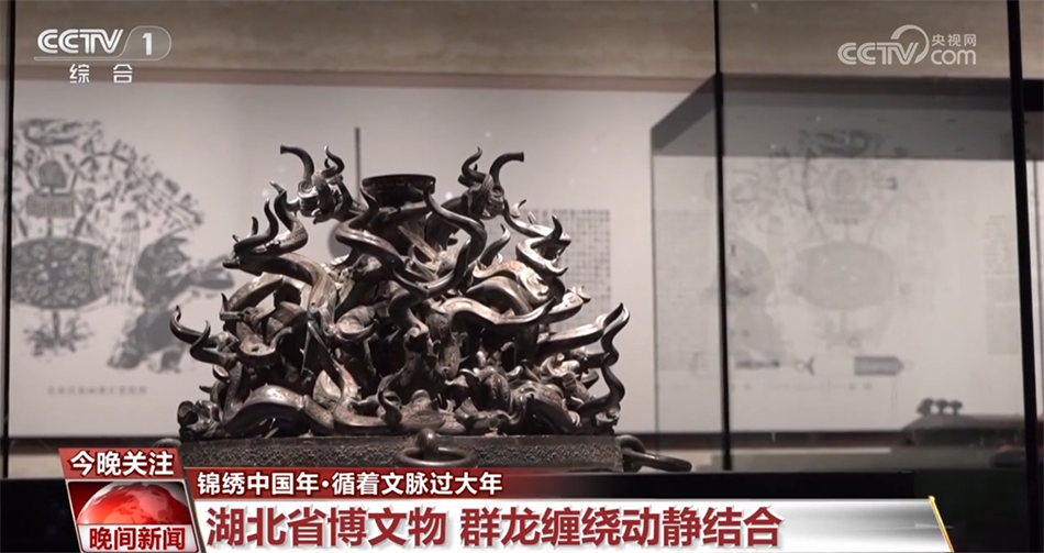 今年春节期间,全国多家博物馆都推出了“龙主题”专题展览,湖北省博物馆的这件精美的文物是曾侯乙铜建鼓座,整个鼓座远看像一盆燃烧的火焰,近看有一群被鼓声惊起的群龙,大龙缠小龙,小龙绕大龙,动静结合。