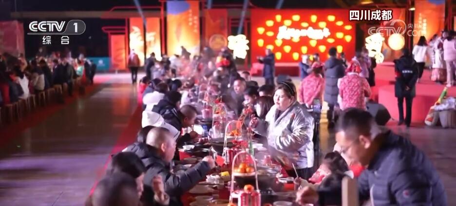 在四川成都新津,一条长达350米的巨型龙灯在主干道上一路摆尾延伸,独具地方特色的长街宴就在此展开,一直从街头摆到了巷尾。辣子鸡、红汤黄辣丁、川西香碗、耙耙菜等当地美食依次上桌,在锣鼓声声、舞狮欢腾的加入下,这顿饭更显得欢乐团圆。