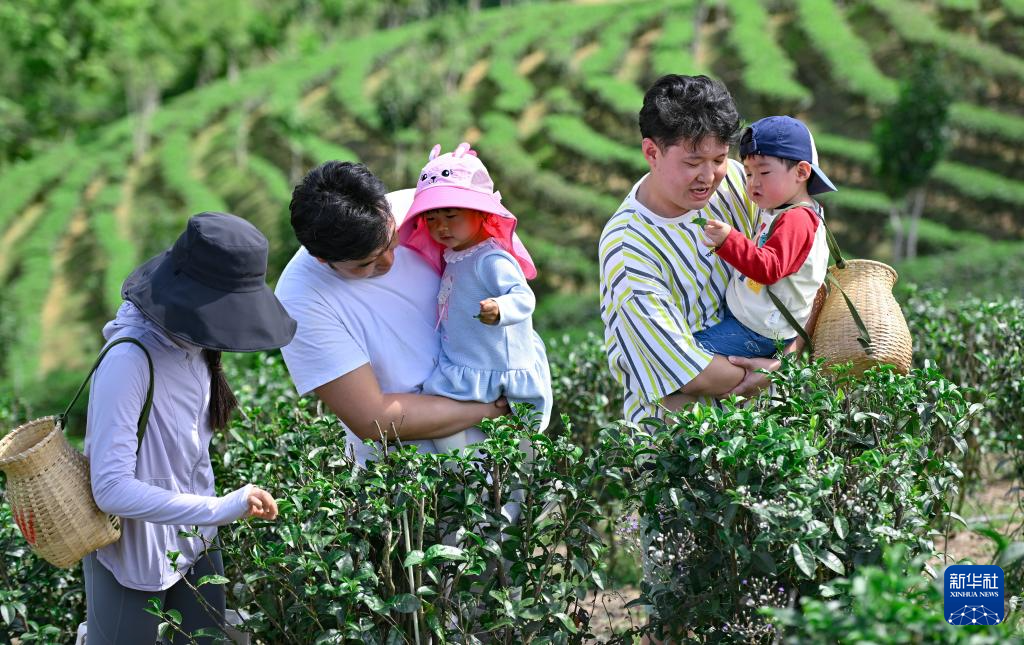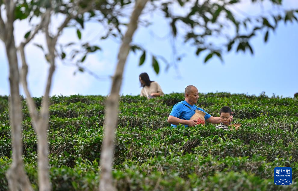 春节假期,许多游客来到海南省五指山市的茶园,踏春赏景、体验采茶乐趣。