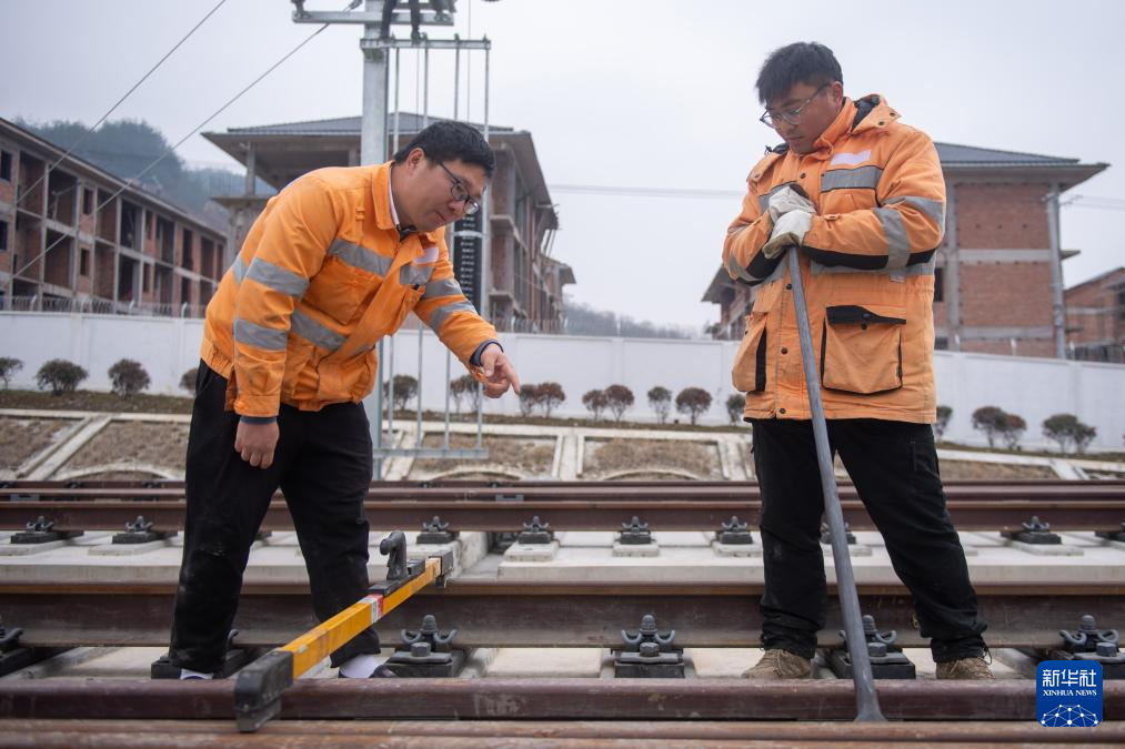 2月27日,铁路宁波工务段职工使用轨道检查仪对杭温铁路轨道进行几何误差的测量作业。