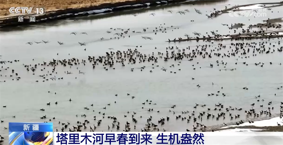 随着天气逐渐转暖,现在在新疆塔里木河,近十万只绿头鸭、针尾鸭、赤麻鸭、红头潜鸭等水鸟畅游在流域大大小小的湿地,从空中俯瞰,冰雪初融的河面上,成群结队的候鸟悠然嬉戏,展现出盎然生机。