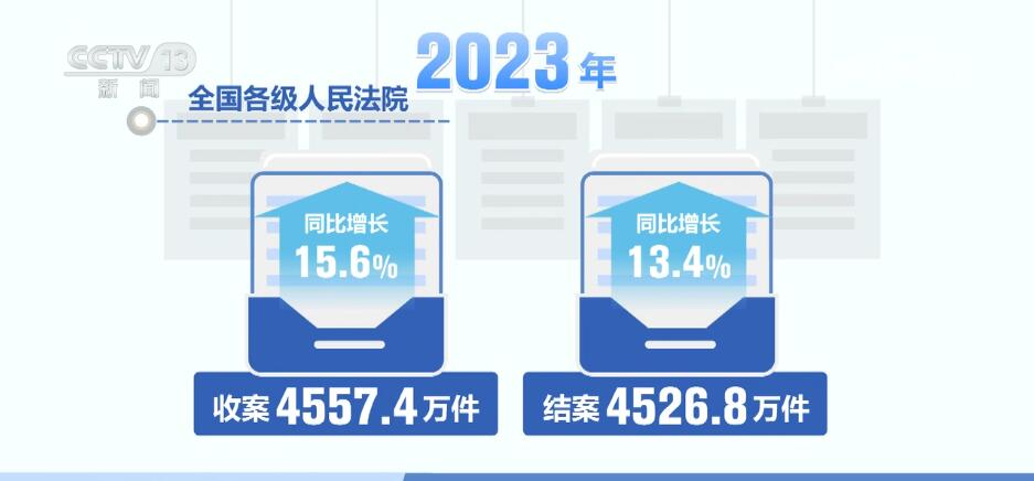 2023年,最高人民法院收案21081件,结案17855件,同比分别增长54.6%、29.5%。全国各级人民法院收案4557.4万件,结案4526.8万件,同比分别增长15.6%、13.4%。