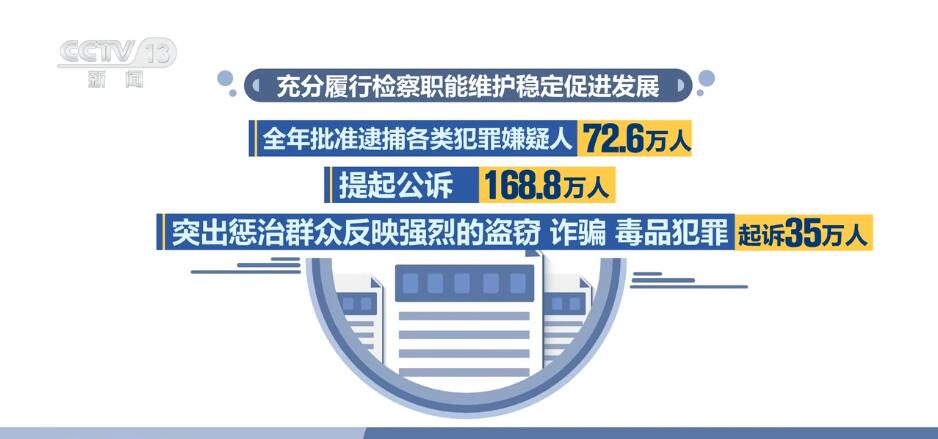 充分履行检察职能维护稳定促进发展。全年批准逮捕各类犯罪嫌疑人72.6万人,提起公诉168.8万人。突出惩治群众反映强烈的盗窃、诈骗、毒品犯罪,起诉35万人。