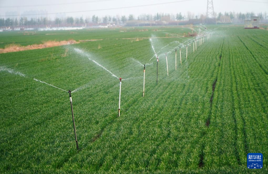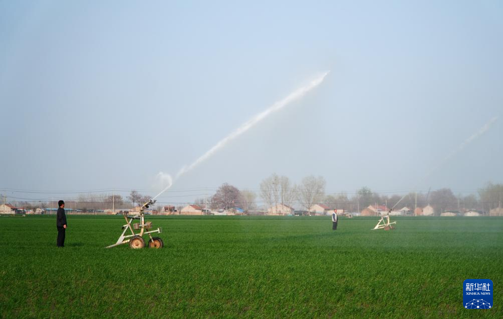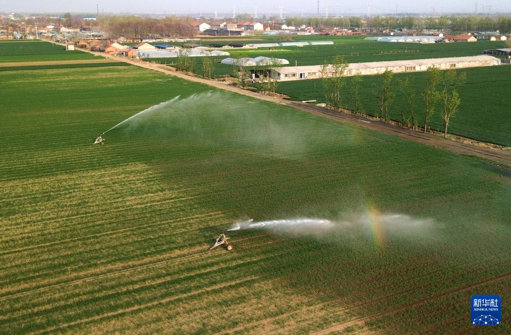 4月8日,在山东省潍坊市寒亭区高里街道,农业灌溉设备在为小麦浇水。
