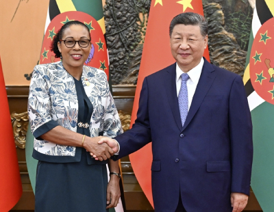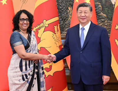 4月27日,治沙技术人员(左二)指导工人扎草方格。
