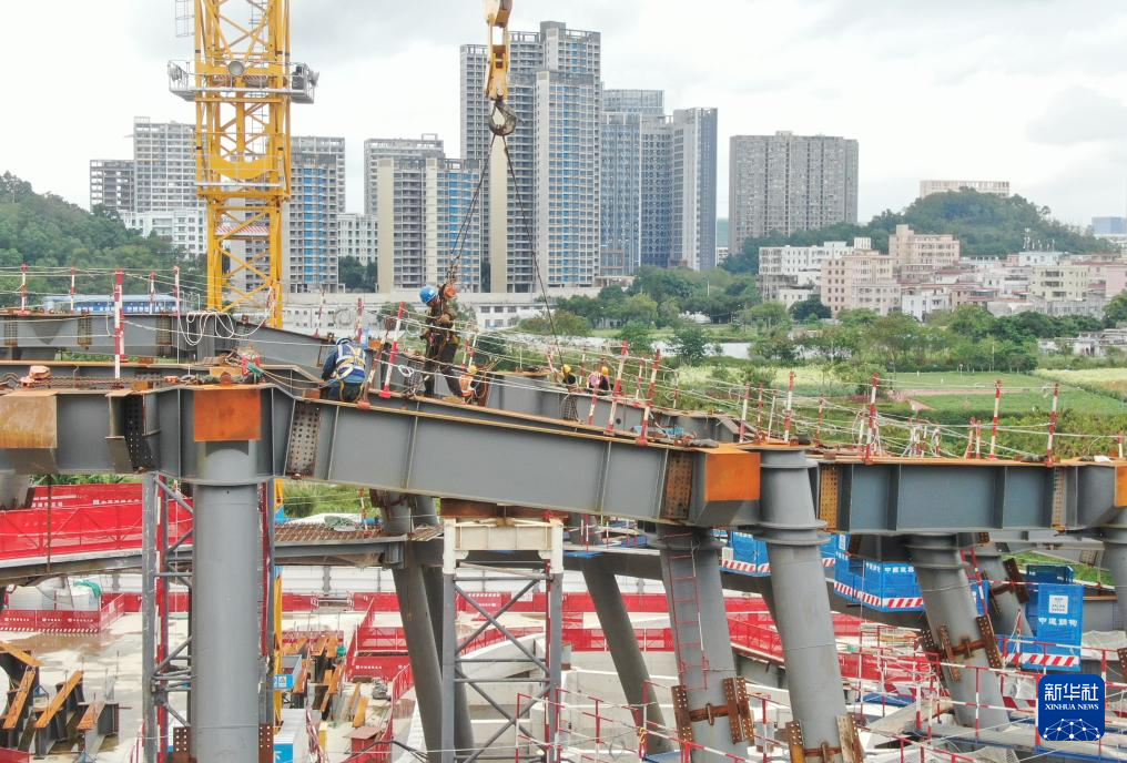 4月29日,工人在深圳自然博物馆项目吊装钢梁(无人机照片)。