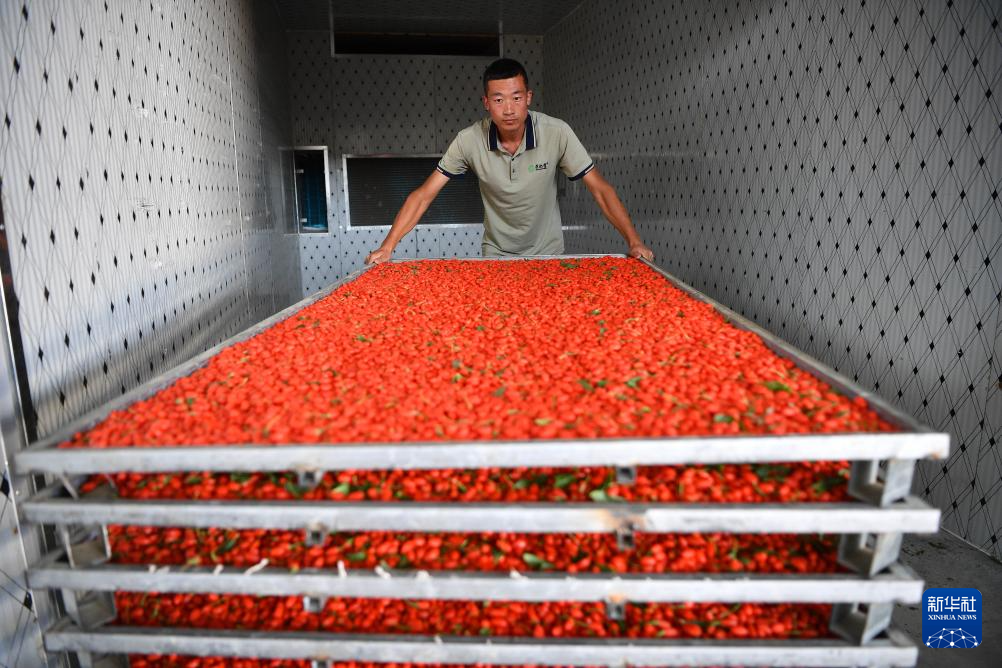 宁夏中卫市沙坡头区兴仁镇中卫市杞园春枸杞种植农民专业合作社的工作人员准备将鲜枸杞进行烘干处理(2023年7月21日摄)。新华社记者王鹏 摄