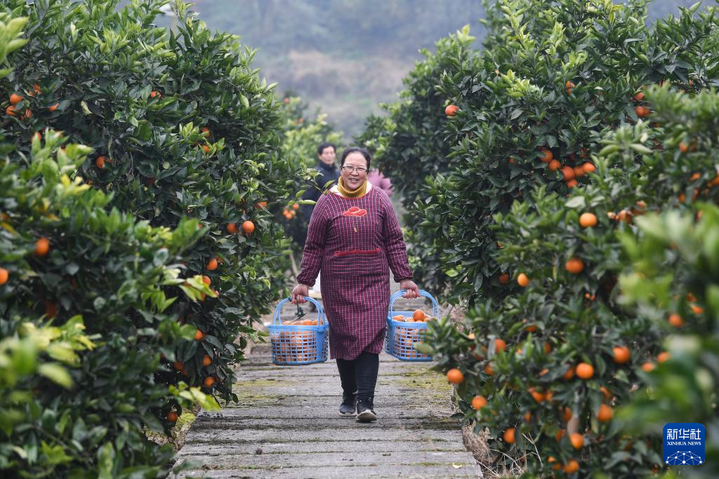 重庆市璧山区七塘镇跃进村村民在提运刚采摘的血橙(2022年1月6日摄)。新华社记者 王全超 摄