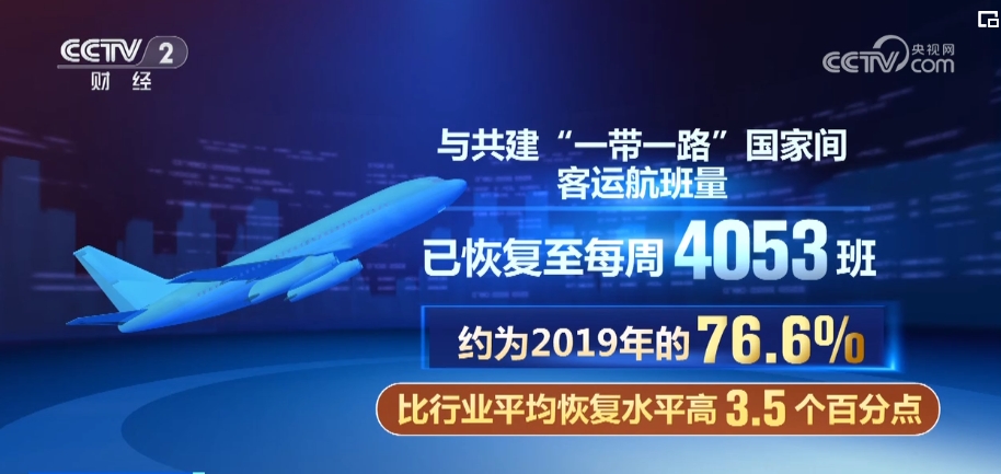 与共建“一带一路”国家间客运航班量已恢复至每周4053班,约为2019年的76.6%,比行业平均恢复水平高3.5个百分点。