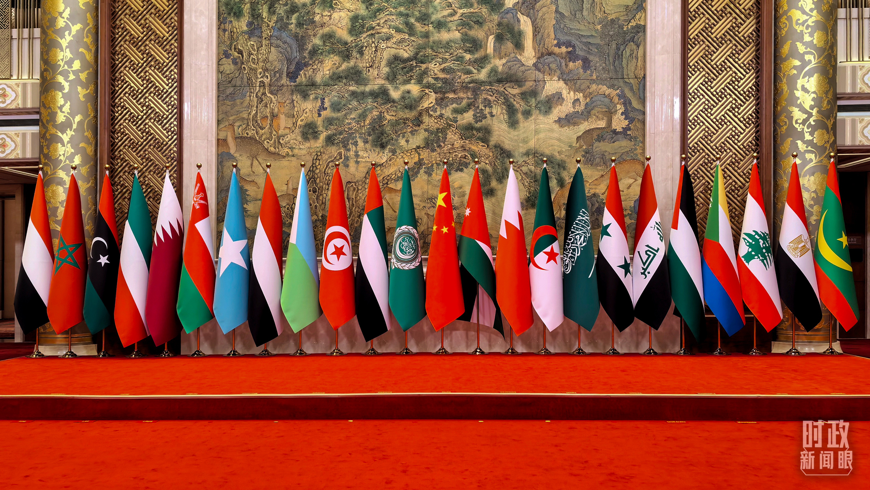 5月30日上午,北京钓鱼台芳华苑内,中国和22个阿拉伯国家国旗以及阿盟旗帜相映成辉。中阿合作论坛第十届部长级会议开幕式在这里举行。