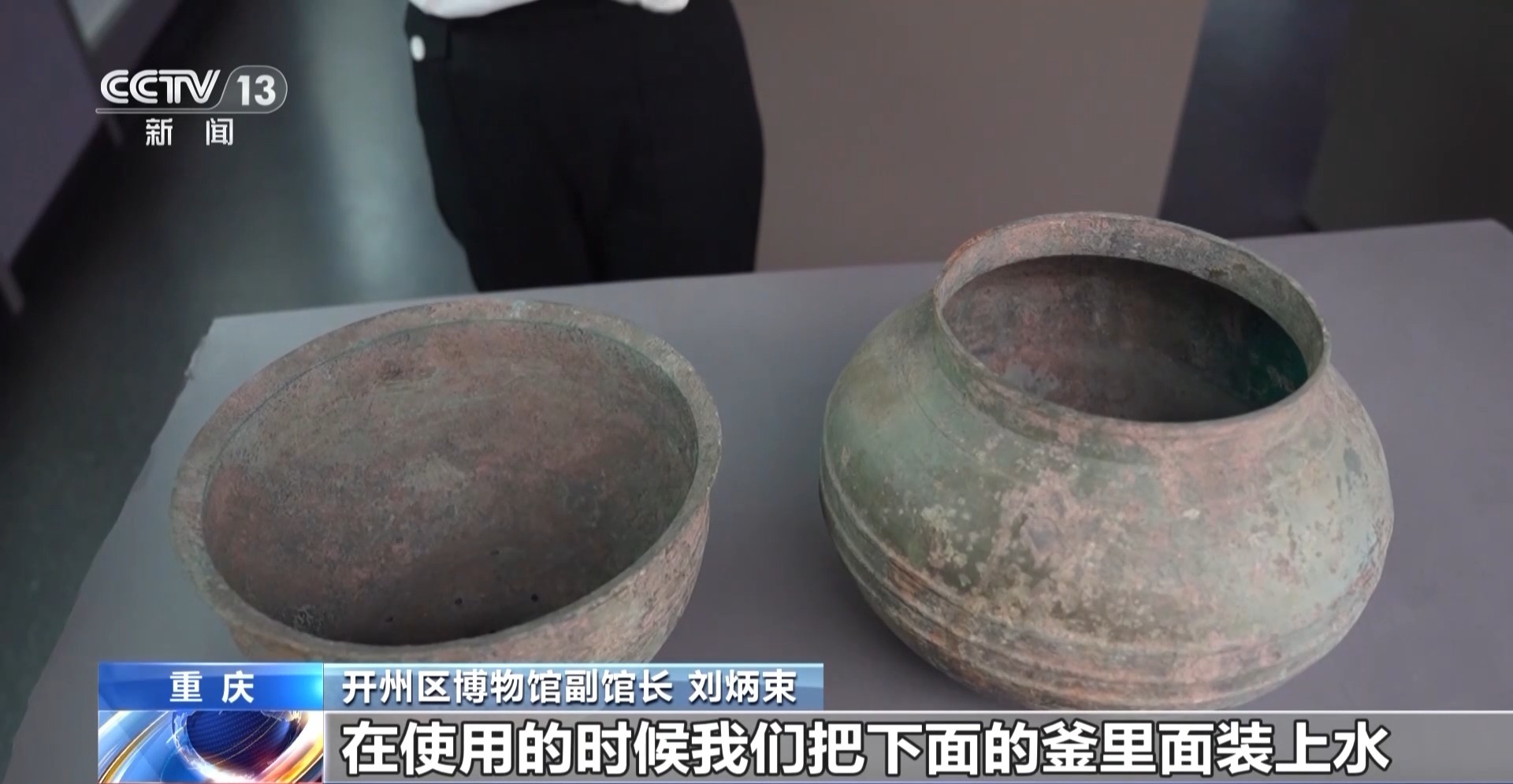 开州区博物馆副馆长刘炳束:这件器物上为甑下为釜,中间有11个大小不等的壁孔。在使用的时候我们把下面的釜里面装上水,然后把食物放在这个甑里面,再把这个甑置于这个釜之上,把整件器物置于火堆之上就可以使用了。在古时候,人们用树叶包裹肉食等方式蒸煮食物,与我们现代端午节蒸粽子的方式相差无几。