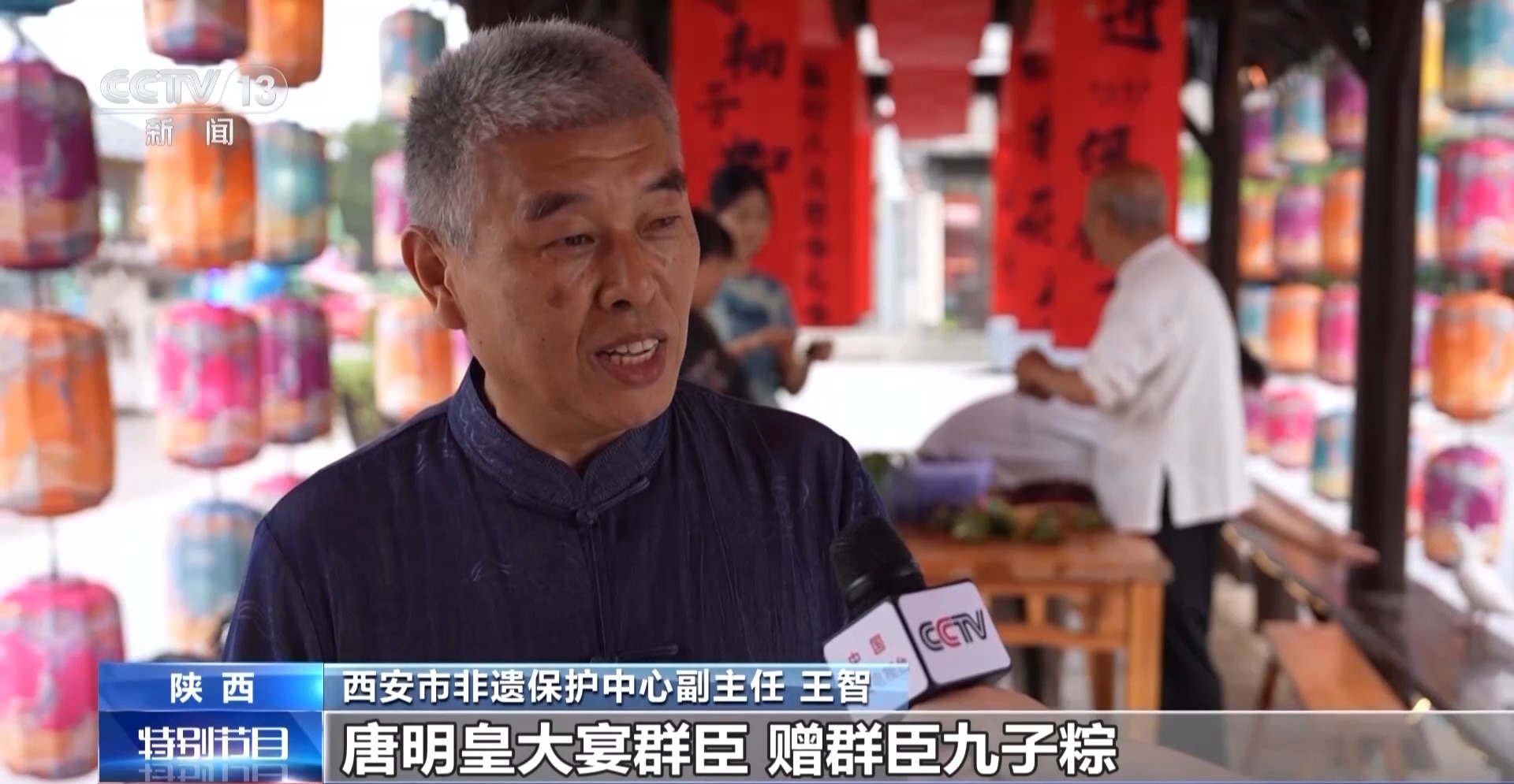 陕西省西安市非遗保护中心副主任王智:唐明皇大宴群臣,赠群臣九子粽。因为这个事唐明皇还写了诗,这个诗里就写着“四时花竞巧,九子粽争新”。