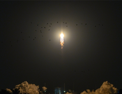 6月25日在北京航天飞行控制中心屏幕上拍摄的嫦娥六号返回器与轨道器分离后的动画模拟画面。