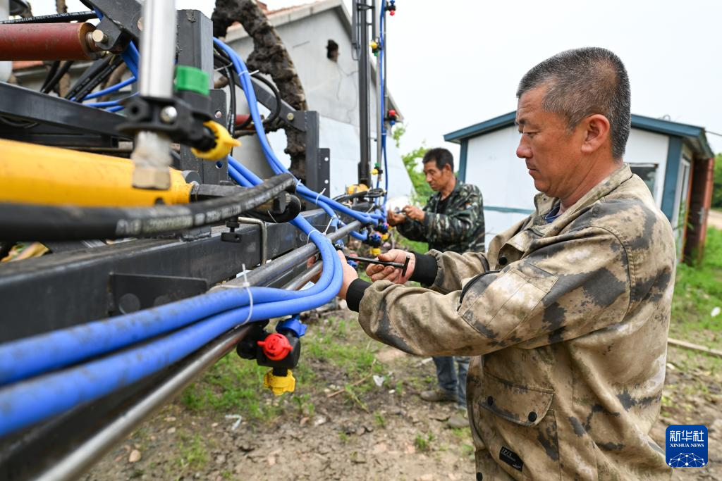 7月3日,在北大荒农业股份有限公司友谊分公司第三管理区,农机手在安装除草机械设备。