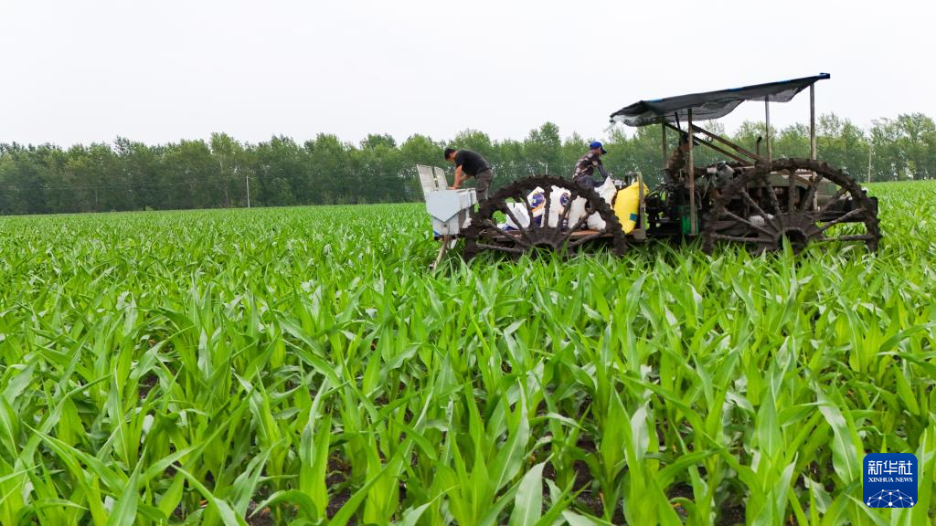 7月3日,在北大荒农业股份有限公司友谊分公司第三管理区一旱田地块,机械设备在进行施肥作业(无人机照片)。