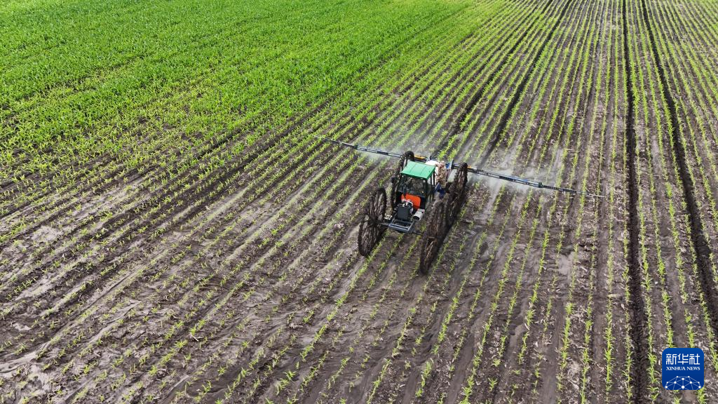 7月3日,在北大荒农业股份有限公司友谊分公司第三管理区一旱田地块,机械设备在进行除草作业(无人机照片)。