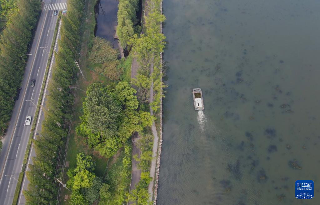 一艘清洁船航行在毗邻G318国道的淀山湖上(8月8日摄,无人机照片)。