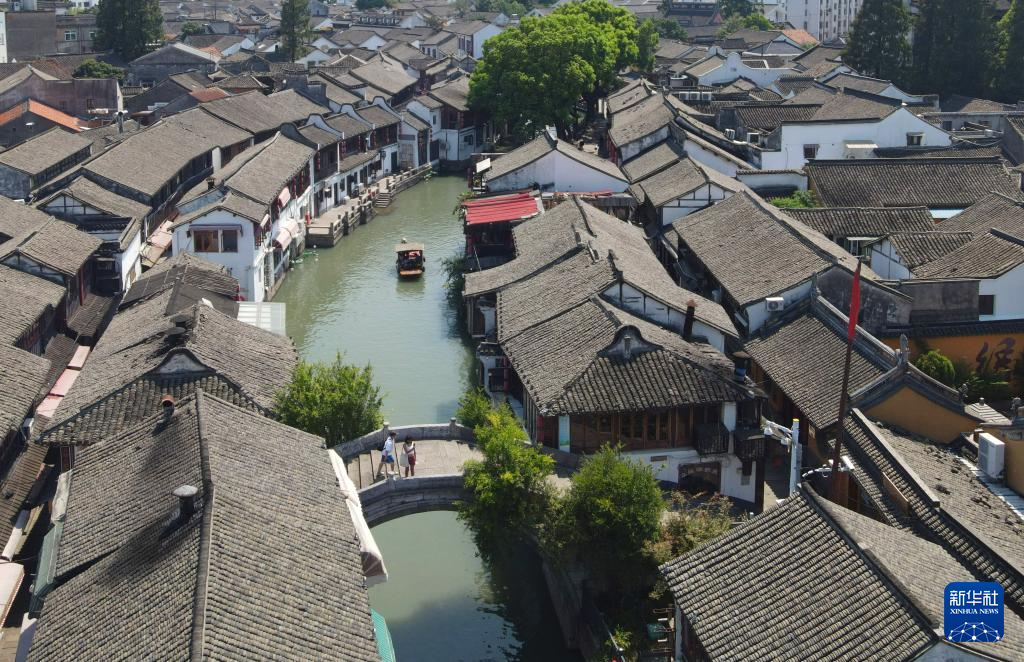 在上海青浦朱家角古镇,游客从一座通行游览船的河道石桥上走过(8月9日摄,无人机照片)。