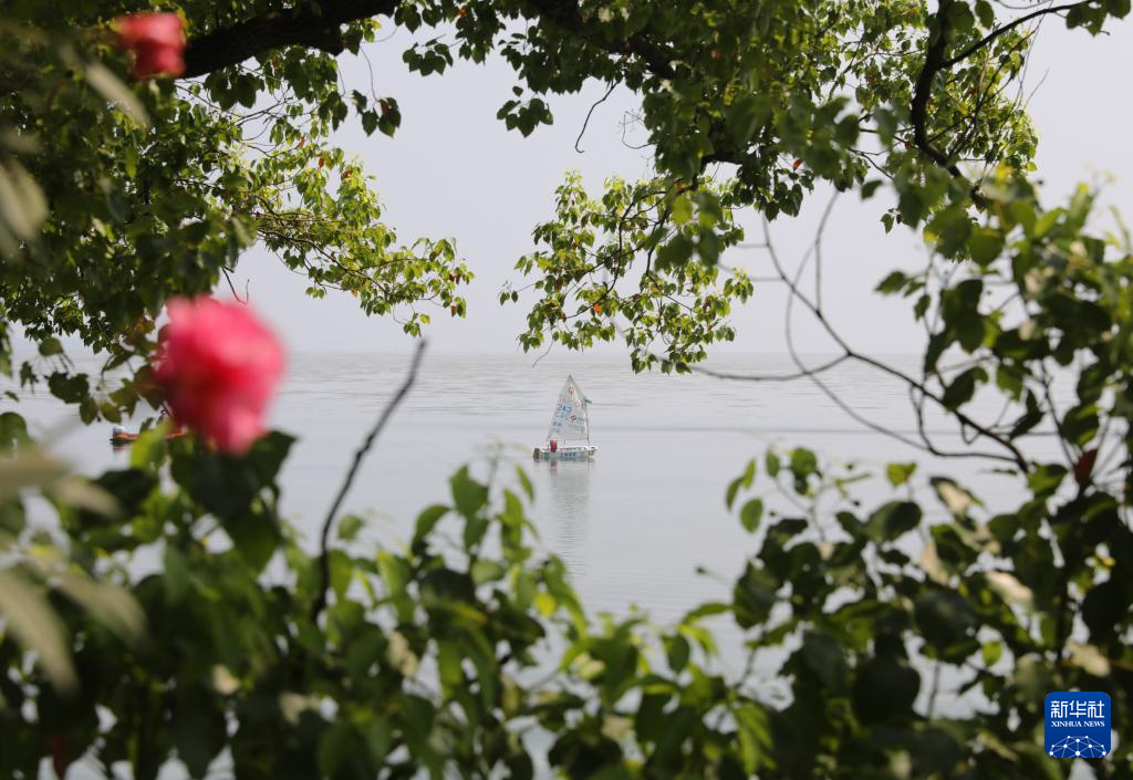 一艘训练中的帆船航行在上海青浦淀山湖上(8月8日摄)。