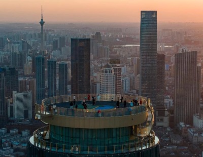 10月10日傍晚,一位游客在富锦国家湿地公园的栈桥上赏景。