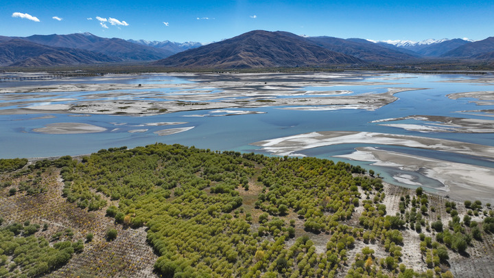 这是雅鲁藏布江宽阔的河床和岸边种植的树木。新华社记者晋美多吉摄