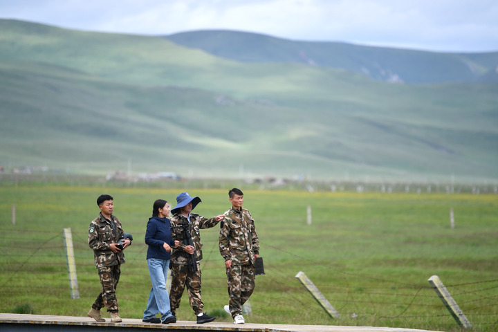 在位于甘肃省甘南藏族自治州的尕海则岔国家级自然保护区,管护中心尕海保护站的工作人员在保护区内巡护(2023年7月7日摄)。新华社记者陈斌摄