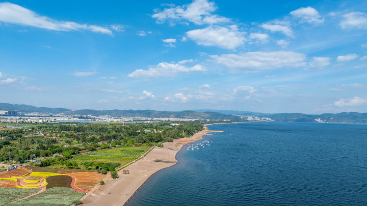 抚仙湖在蓝天白云的映衬下显得格外美丽。新华社记者胡超摄